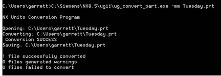 Note that the default directory where the command line starts is in the folder of the username “garrett” on the computer. Therefore, in order for the operating system to find the actual command file, the pathname of the containing folder, C:\Siemens\NX8.5\ugii\, also needs to be entered in front of the command. This is the “root directory” of NX. There are other methods of running this executable.
